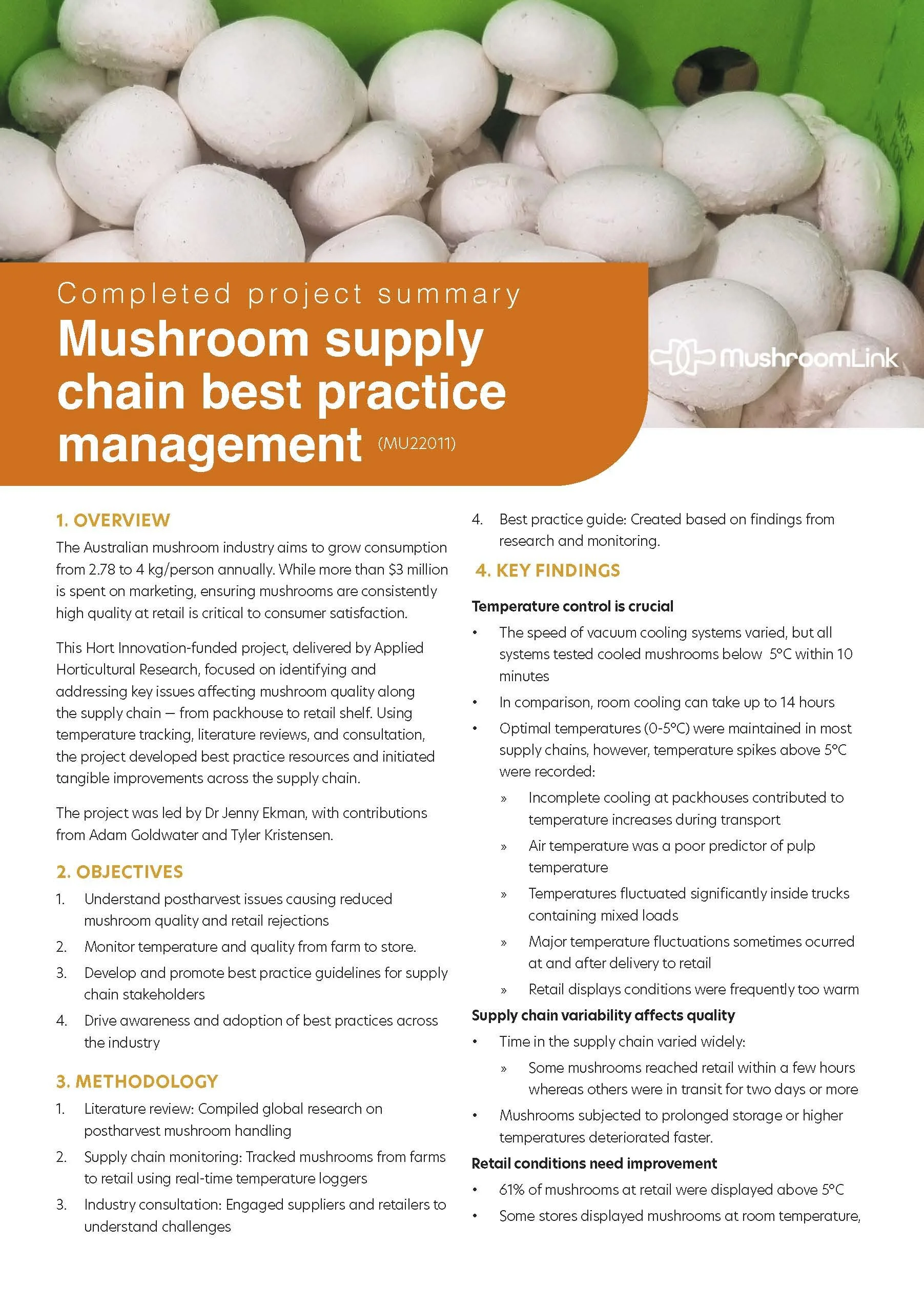 We've pulled together a concise two-page summary of the Mushroom supply chain best practice management project to make key insights from the full Hort Innovation final report easier to access. The summary highlights the objectives, methodology, key findings, and recommendations to help improve produce quality, reduce waste, and boost profitability across the supply chain.